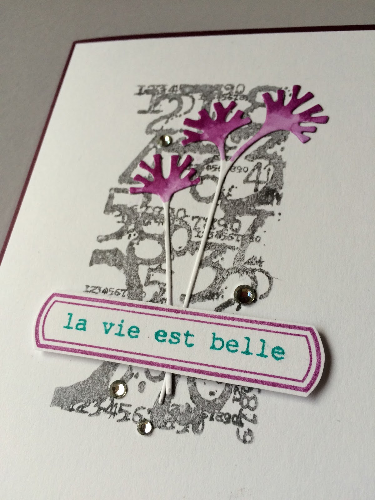 Voici une première carte avec une partie des nouveautés.Pour le tampon de fond, j'ai vaporisé un peu d'eau sur le tampon (déjà encré) pour avoir un effet un peu aquarellé au moment du tamponnage (technique que j'avais vu sur scarifiant avec Manuela Jamet).